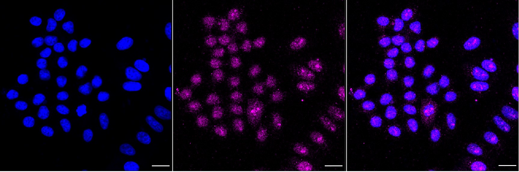 Immunocytochemical staining of HepG2 cells with Phospho-EGFR (Y1173) antibody. Nuclei were stained blue with DAPI; Phospho-EGFR (Y1173) was stained magenta with Alexa Fluor? 647. Images were taken using Leica stellaris 5. Protein abundance based on laser Intensity and smart gain: Medium. Scale bar, 20 μm.