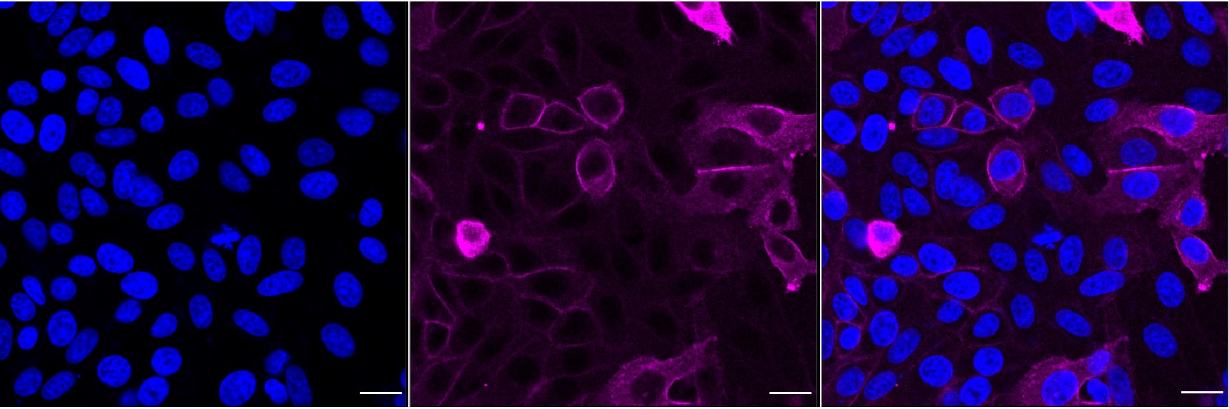 Immunocytochemical staining of HepG2 cells with EGFR antibody. Nuclei were stained blue with DAPI; EGFR was stained magenta with Alexa Fluor? 647. Images were taken using Leica stellaris 5. Protein abundance based on laser Intensity and smart gain: High. Scale bar, 20 μm.