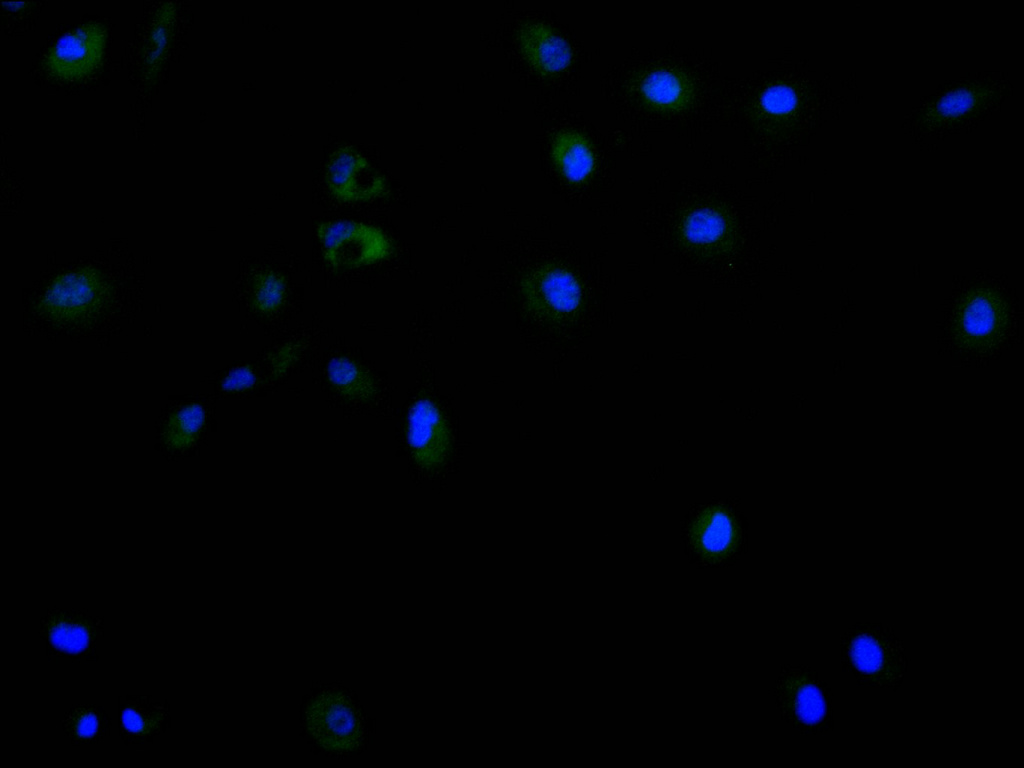 Immunofluorescence staining of A549 cell with CSB-RA088784A0HU at 1:50, counter-stained with DAPI. The cells were fixed in 4% formaldehyde, permeabilized using 0.2% Triton X-100 and blocked in 10% normal Goat Serum. The cells were then incubated with the antibody overnight at 4°C. The secondary antibody was Alexa Fluor 488-congugated AffiniPure Goat Anti-Rabbit IgG(H+L).
