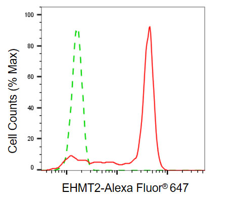 Flow cytometric analysis of EHMT2 expression in HepG2 cells using EHMT2 antibody. Green, isotype control; red, EHMT2.