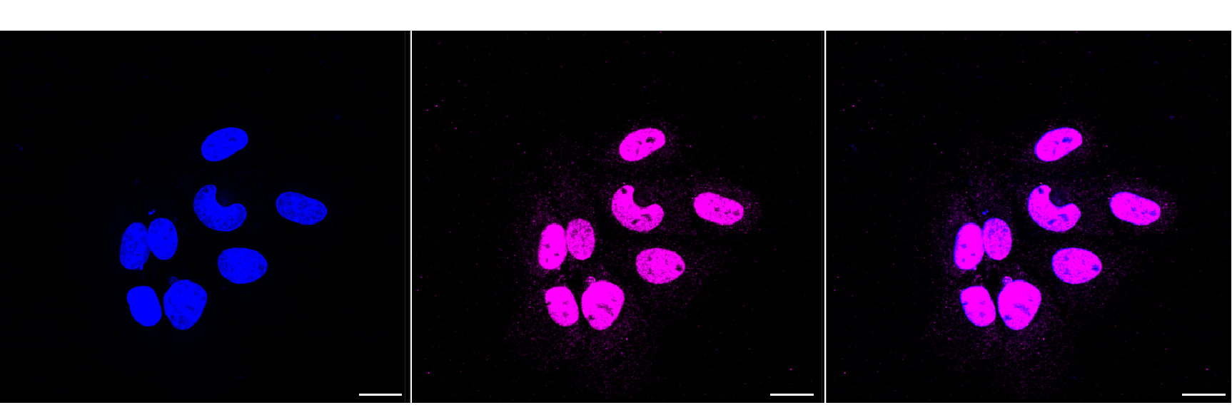 Immunocytochemical staining of HepG2 cells with EHMT2 antibody. Nuclei were stained blue with DAPI; EHMT2 was stained magenta with Alexa Fluor? 647. Images were taken using Leica stellaris 5. Protein abundance based on laser Intensity and smart gain: Medium. Scale bar, 20 μm.