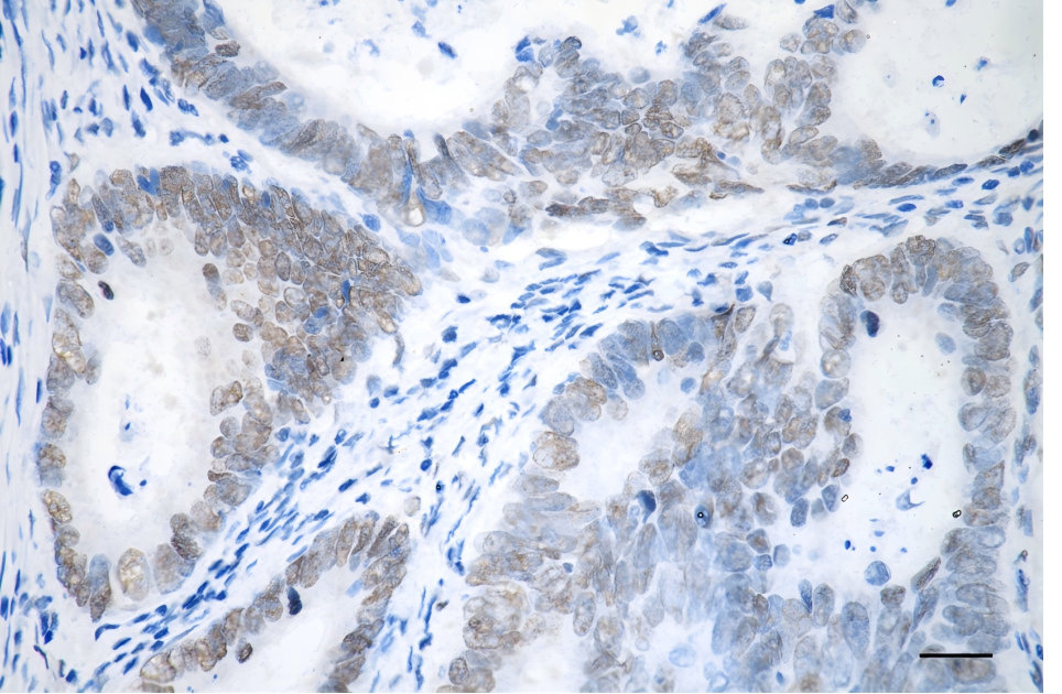 Immunohistochemistry was performed on paraffin-embedded human sigmoid colon carcinoma using EHMT2 antibody. Antigen retrieval was done in sodium citrate buffer (pH 6.0). DAB was used for detection, with hematoxylin counterstaining. Images were acquired using a Nikon Ci-L Plus microscope (40× objective). Scale bar: 25 μm.
