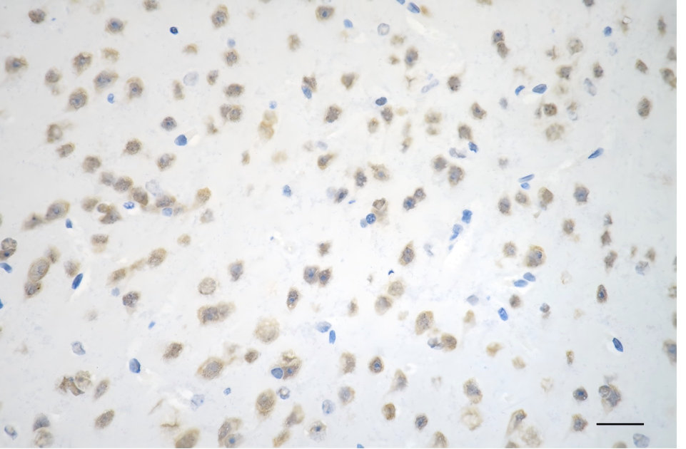 Immunohistochemistry was performed on paraffin-embedded mouse brain using EHMT2 antibody. Antigen retrieval was done in sodium citrate buffer (pH 6.0). DAB was used for detection, with hematoxylin counterstaining. Images were acquired using a Nikon Ci-L Plus microscope (40× objective). Scale bar: 25 μm.