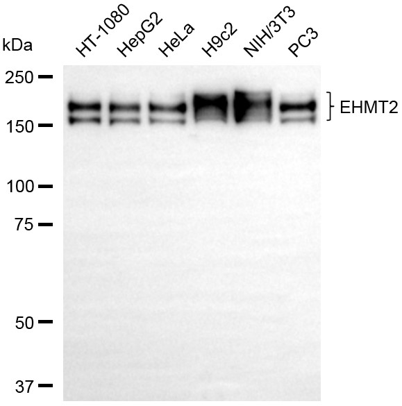 Western blotting analysis using EHMT2 antibody. Total cell lysates (30 μg) from various cell lines were loaded and separated by SDS-PAGE. The blot was incubated with EHMT2 antibody and HRP-conjugated goat anti-rabbit secondary antibody respectively.
