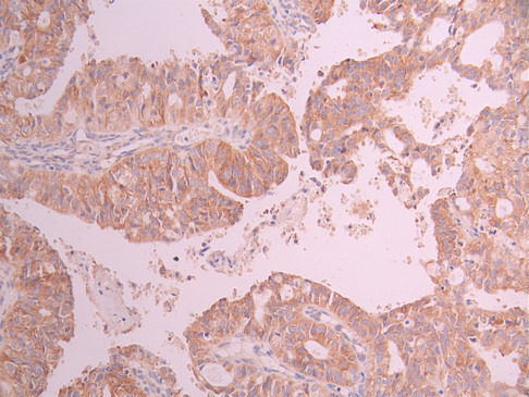 IHC image of CSB-RA698596A0HU diluted at 1:100 and staining in paraffin-embedded human ovarian cancer performed on a Leica BondTM system. After dewaxing and hydration, antigen retrieval was mediated by high pressure in a citrate buffer (pH 6.0). Section was blocked with 10% normal goat serum 30min at RT. Then primary antibody (1% BSA) was incubated at 4°C overnight. The primary is detected by a Goat anti-rabbit polymer IgG labeled by HRP and visualized using 0.05% DAB.