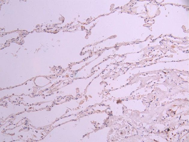IHC image of CSB-RA698596A0HU diluted at 1:100 and staining in paraffin-embedded human lung tissue performed on a Leica BondTM system. After dewaxing and hydration, antigen retrieval was mediated by high pressure in a citrate buffer (pH 6.0). Section was blocked with 10% normal goat serum 30min at RT. Then primary antibody (1% BSA) was incubated at 4°C overnight. The primary is detected by a Goat anti-rabbit polymer IgG labeled by HRP and visualized using 0.05% DAB.