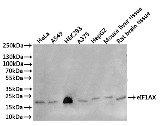 Positive WB detected in: Hela whole cell lysate(30μg), A549 whole cell lysate(30μg), HEK293 whole cell lysate(30μg), A375 whole cell lysate(30μg), HepG2 whole cell lysate(30μg), Mouse liver tissue lysate(30μg), Rat brain tissue lysate(30μg)