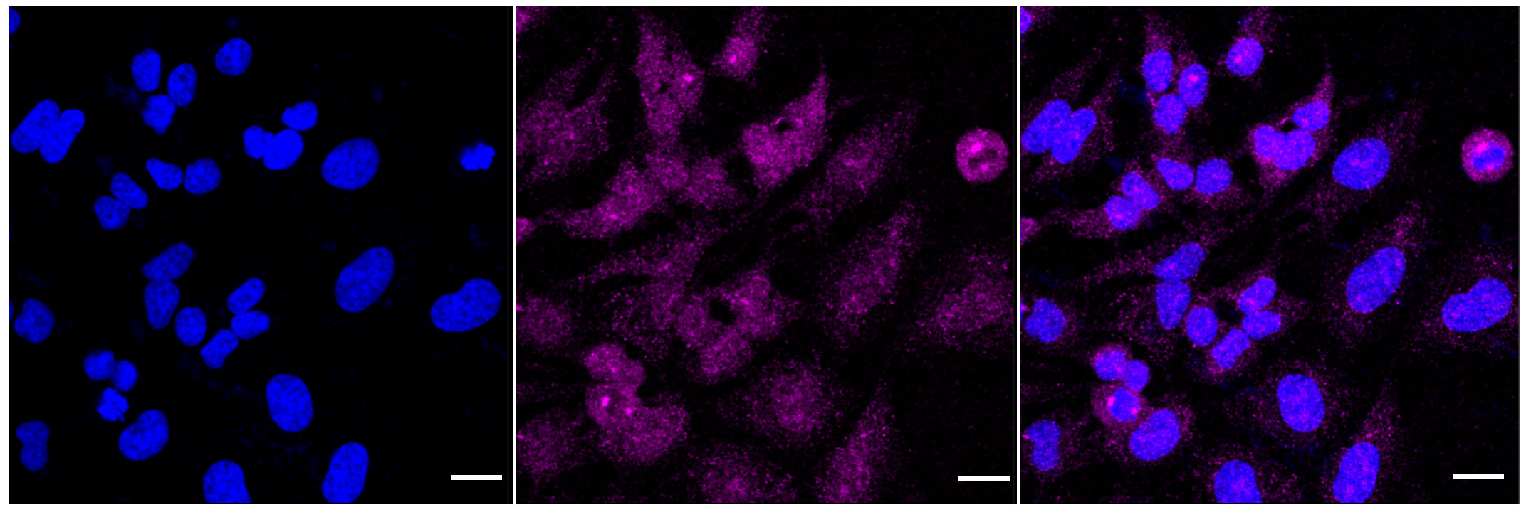 Immunocytochemical staining of HeLa cells with EIF3E antibody . Nuclei were stained blue with DAPI; EIF3E was stained magenta with Alexa Fluor? 647. Images were taken using Leica stellaris 5. Protein abundance based on laser Intensity and smart gain:Medium. Scale bar, 20 μm.