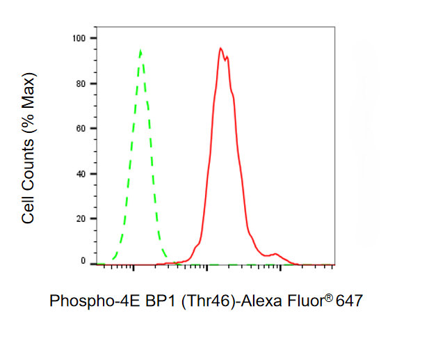Flow cytometric analysis of Phospho-4E BP1 (Thr46) expression in C2C12 cells using Phospho-4E BP1 (Thr46) antibody. Green, isotype control; red, Phospho-4E BP1 (Thr46).