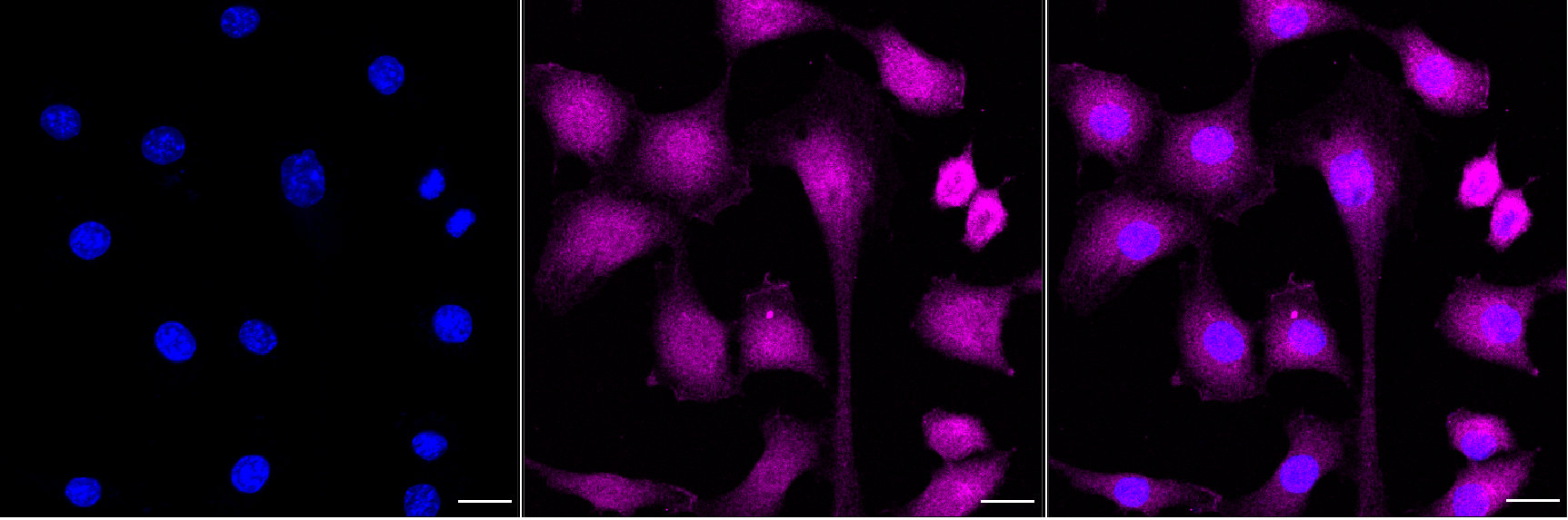 Immunocytochemical staining of C2C12 cells with Phospho-4E BP1 (Thr46) antibody. Nuclei were stained blue with DAPI; Phospho-4E BP1 (Thr46) was stained magenta with Alexa Fluor? 647. Images were taken using Leica stellaris 5. Protein abundance based on laser Intensity and smart gain: Medium. Scale bar, 20 μm.