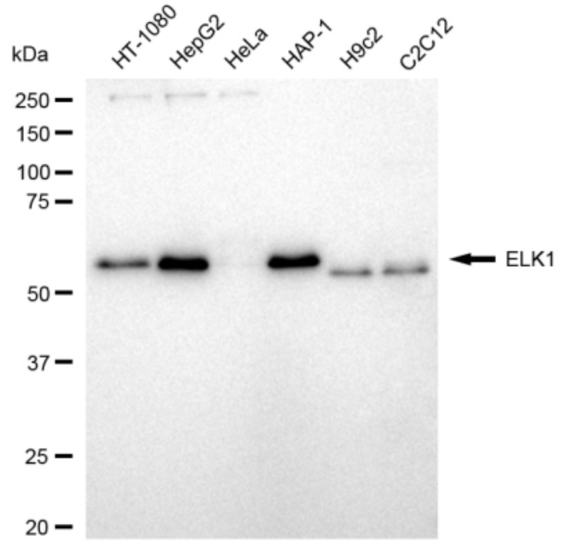 Western blotting analysis using ELK1 antibody. Total cell lysates (30 μg) from various cell lines were loaded and separated by SDS-PAGE. The blot was incubated with ELK1 antibody and HRP-conjugated goat anti-rabbit secondary antibody respectively.