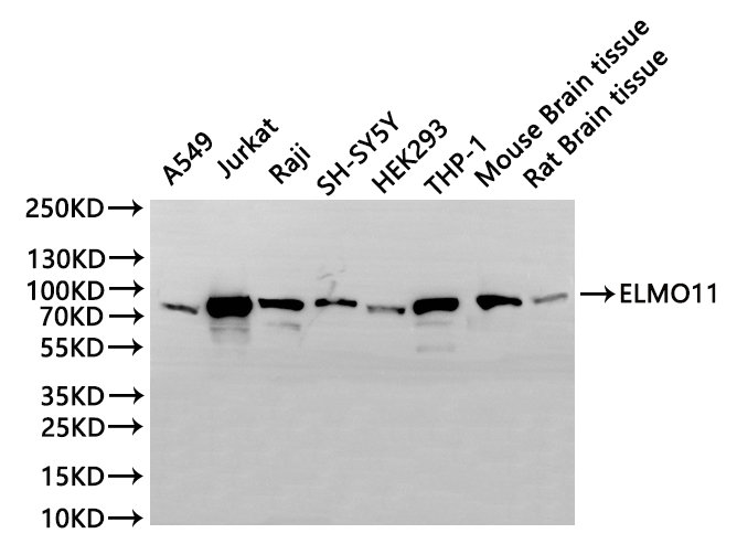 , Positive WB detected in: A549 whole cell lysate(30μg), Jurkat whole cell lysate(30μg), Raji whole cell lysate(30μg), SH-SY5Y whole cell lysate(30μg), HEK293 whole cell lysate(30μg), THP-1 whole cell lysate(30μg), Mouse brain tissue lysate(30μg), Rat brain tissue lysate(30μg)
