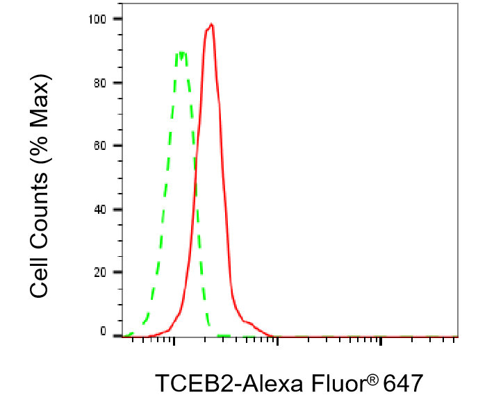 Flow cytometric analysis of TCEB2 expression in HepG2 cells using TCEB2 antibody. Green, isotype control; red, TCEB2.