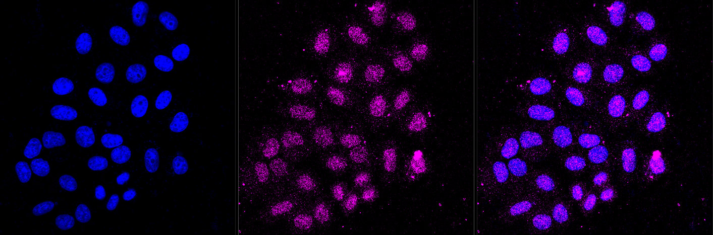 Immunocytochemical staining of HepG2 cells with TCEB2 antibody. Nuclei were stained blue with DAPI; TCEB2 was stained magenta with Alexa Fluor? 647. Images were taken using Leica stellaris 5. Protein abundance based on laser Intensity and smart gain: Low. Scale bar, 20 μm.