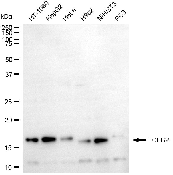Western blotting analysis using TCEB2 antibody. Total cell lysates (30 μg) from various cell lines were loaded and separated by SDS-PAGE. The blot was incubated with TCEB2 antibody and HRP-conjugated goat anti-rabbit secondary antibody respectively.