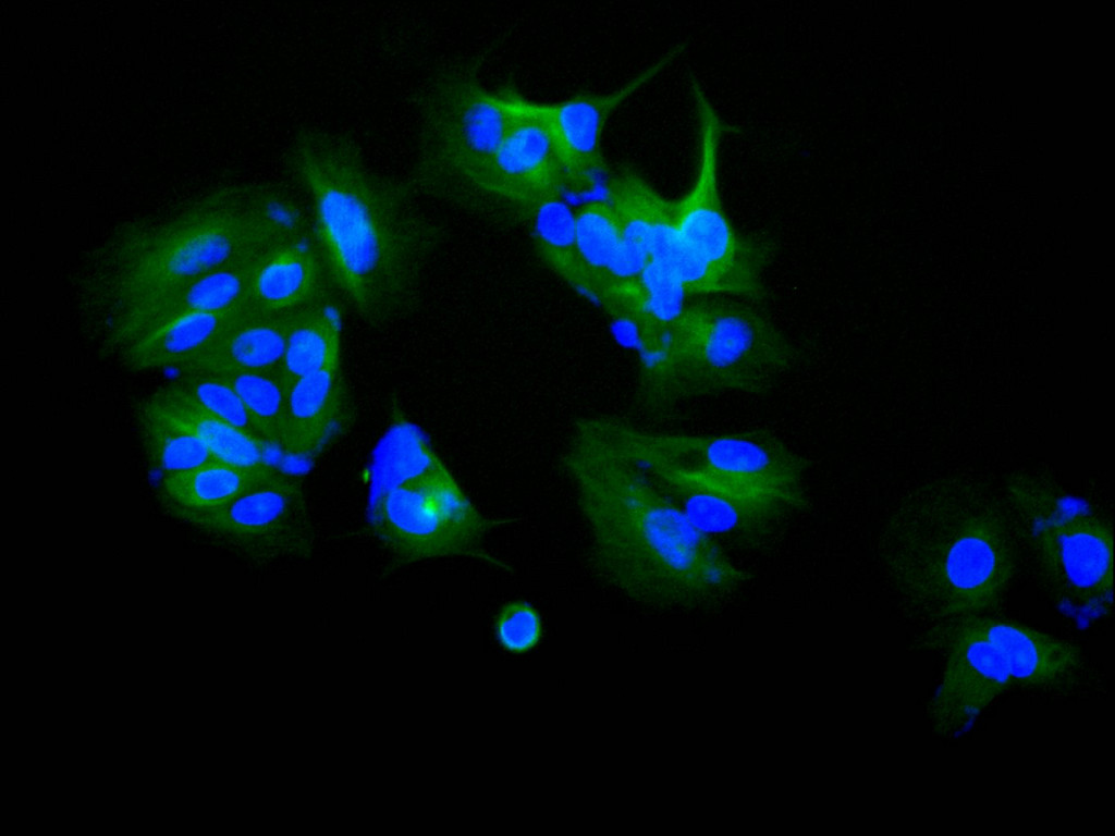 Immunofluorescence staining of MCF-7 cell with CSB-RA264351A0HU at 1:50 , counter-stained with DAPI. The cells were fixed in 4% formaldehyde, permeabilized using 0.2% Triton X-100 and blocked in 10% normal Goat Serum. The cells were then incubated with the antibody overnight at 4°C. The secondary antibody was Alexa Fluor 488-congugated AffiniPure Goat Anti-Rabbit IgG(H+L).