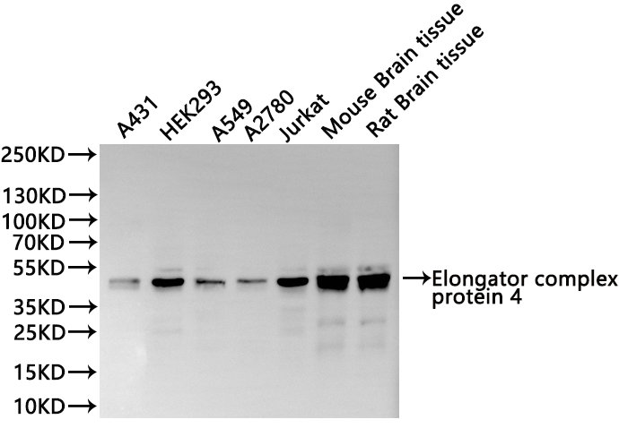 Positive WB detected in: A431 whole cell lysate(30μg), HEK293 whole cell lysate(30μg), A549 whole cell lysate(30μg), A2780 whole cell lysate(30μg), Jurkat whole cell lysate(30μg), Mouse brain tissue lysate(30μg), Rat brain tissue lysate(30μg)