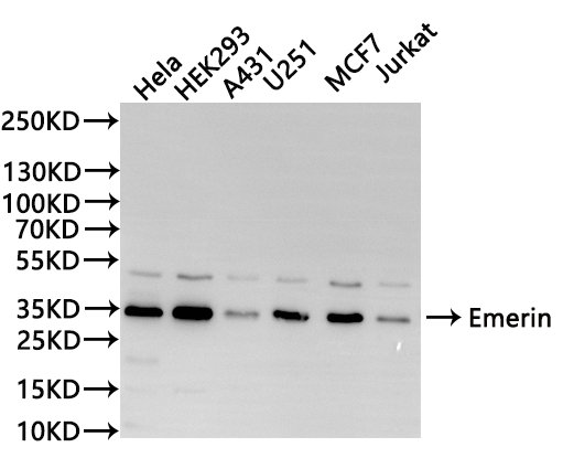 All lanes: Emerin antibody at 1:1000