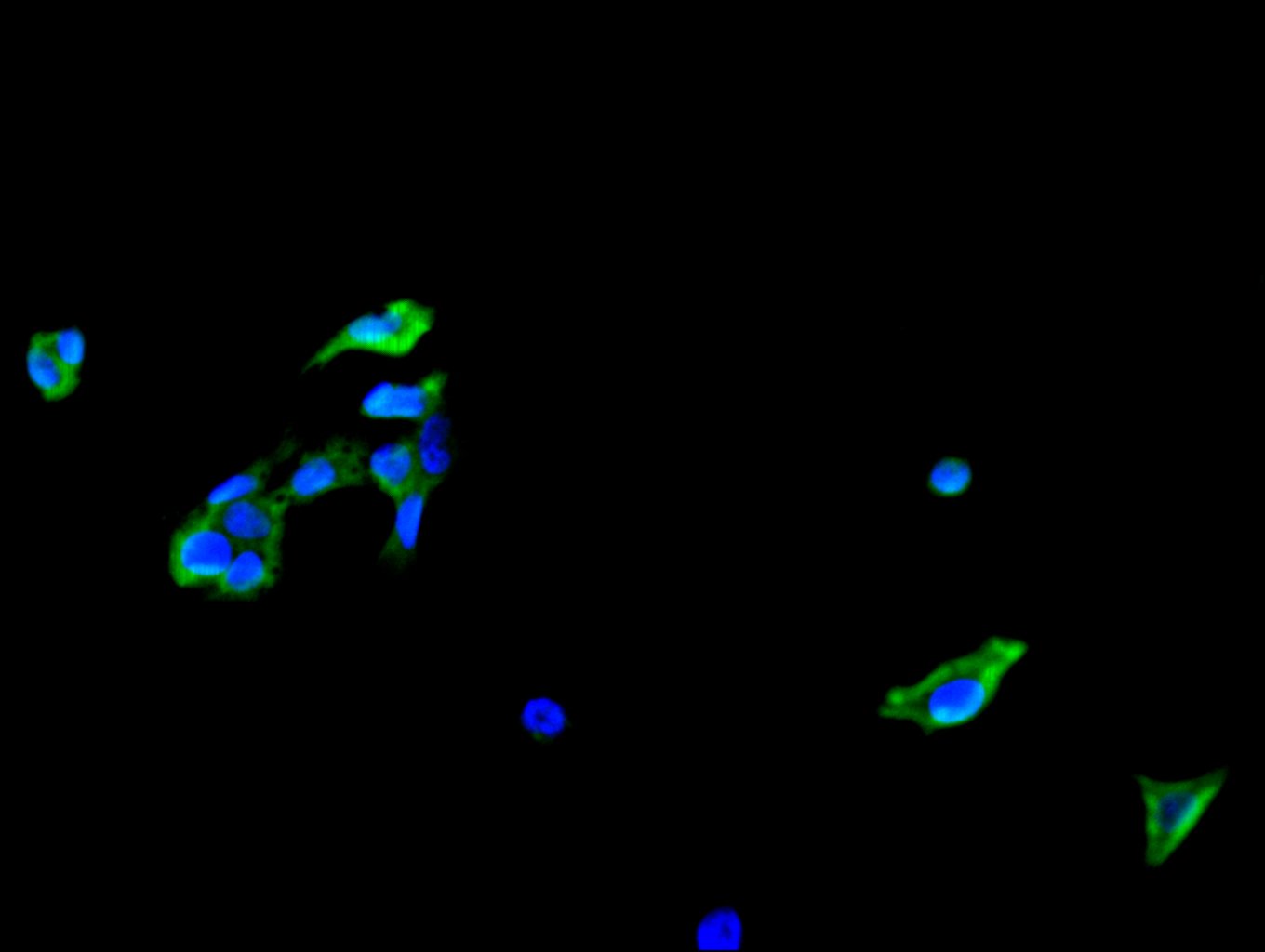 Immunofluorescence staining of HepG2 cell with CSB-RA007670MA1HU at 1:30 counter-stained with DAPI. The cells were fixed in 4% formaldehyde, permeabilized using 0.2% Triton X-100 and blocked in 10% normal Goat Serum. The cells were then incubated with the antibody overnight at 4°C. The secondary antibody was Fluorescein (FITC) AffiniPure Goat Anti-Human IgG, Fcγ fragment specific.