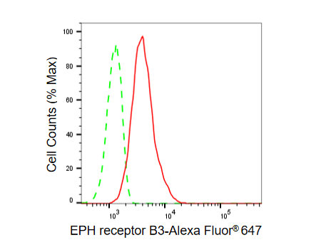 Flow cytometric analysis of EPH receptor B3 expression in C2C12 cells using EPH receptor B3 antibody. Green, isotype control; red, EPH receptor B3.