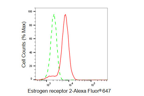Flow cytometric analysis of Estrogen receptor 2 expression in HeLa cells using Estrogen receptor 2 antibody. Green, isotype control; red, Estrogen receptor 2.