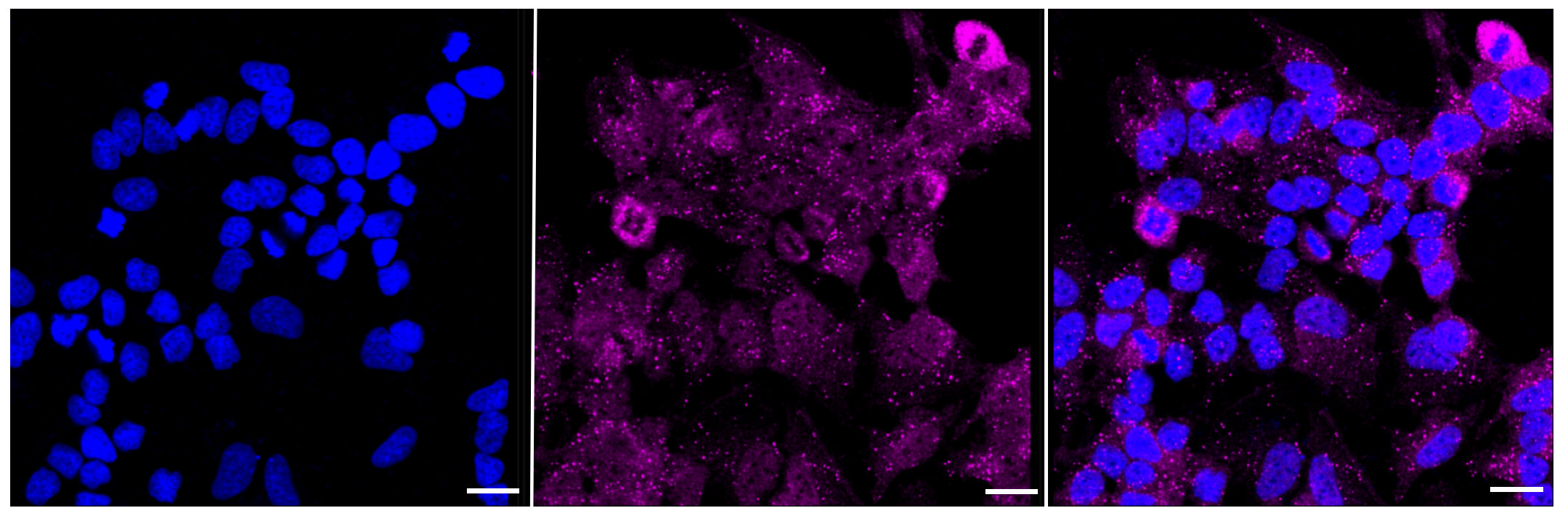Immunocytochemical staining of Hela cells with Estrogen receptor 2 antibody. Nuclei were stained blue with DAPI; Estrogen receptor 2 was stained magenta with Alexa Fluor? 647. Images were taken using Leica stellaris 5. Protein abundance based on laser Intensity and smart gain: High. Scale bar: 20 μm.