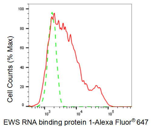 Flow cytometric analysis of EWS RNA binding protein 1 expression in HT-1080 cells using EWS RNA binding protein 1 antibody. Green, isotype control; red, EWS RNA binding protein 1.