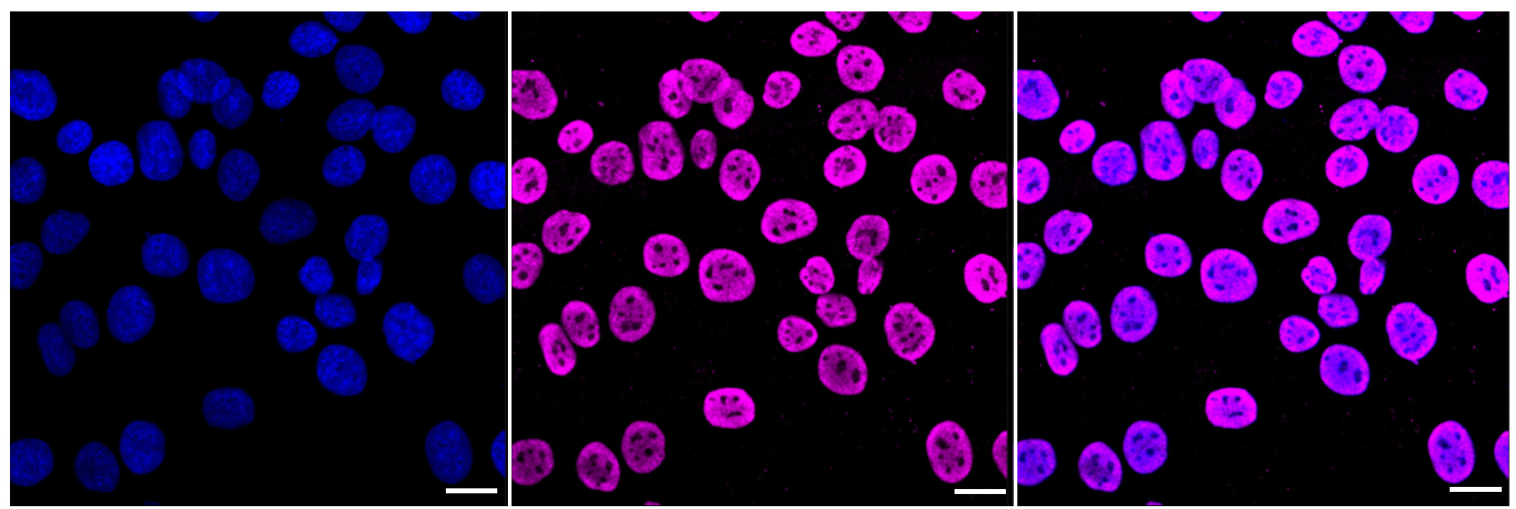 Immunocytochemical staining of HT-1080 cells with EWS RNA binding protein 1 antibody. Nuclei were stained blue with DAPI; EWS RNA binding protein 1 was stained magenta with Alexa Fluor? 647. Images were taken using Leica stellaris 5. Protein abundance based on laser Intensity and smart gain: High. Scale bar: 20 μm.