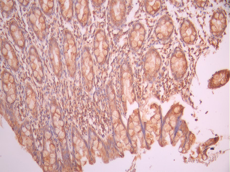 IHC image of CSB-RA032745A0HU diluted at 1:100 and staining in paraffin-embedded human small intestine tissue performed on a Leica BondTM system. After dewaxing and hydration, antigen retrieval was mediated by high pressure in a citrate buffer (pH 6.0). Section was blocked with 10% normal goat serum 30min at RT. Then primary antibody (1% BSA) was incubated at 4°C overnight. The primary is detected by a Goat anti-rabbit polymer IgG labeled by HRP and visualized using 0.05% DAB.