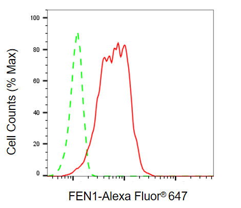 Flow cytometric analysis of FEN1 expression in HepG2 cells using FEN1 antibody. Green, isotype control; red, FEN1.