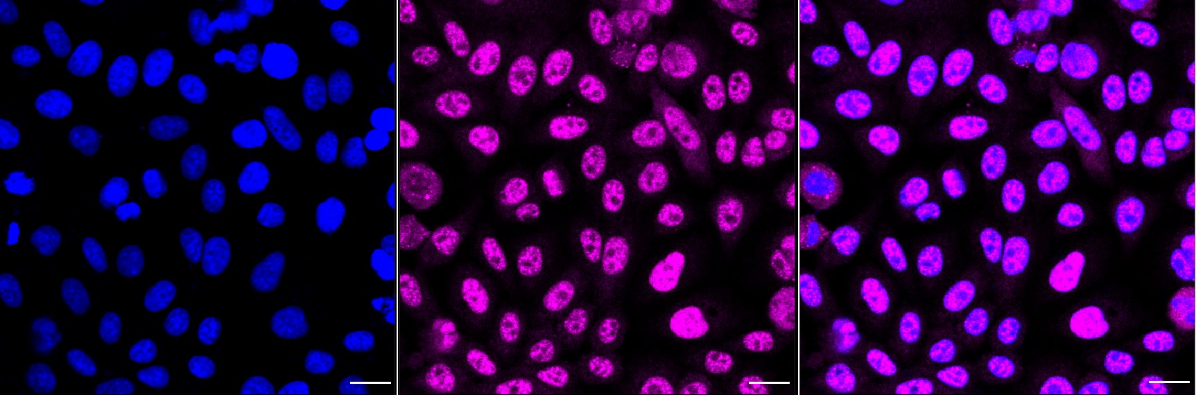 Immunocytochemical staining of HepG2 cells with FEN1 antibody. Nuclei were stained blue with DAPI; FEN1 was stained magenta with Alexa Fluor? 647. Images were taken using Leica stellaris 5. Protein abundance based on laser Intensity and smart gain: Medium. Scale bar, 20 μm.