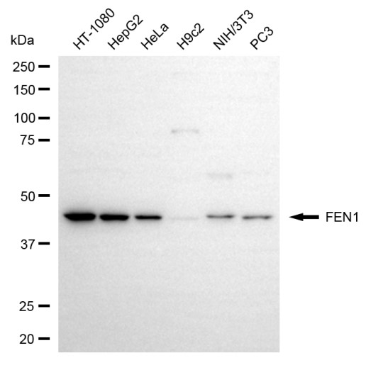 Western blotting analysis using FEN1 antibody. Total cell lysates (30 μg) from various cell lines were loaded and separated by SDS-PAGE. The blot was incubated with FEN1 antibody and HRP-conjugated goat anti-rabbit secondary antibody respectively.
