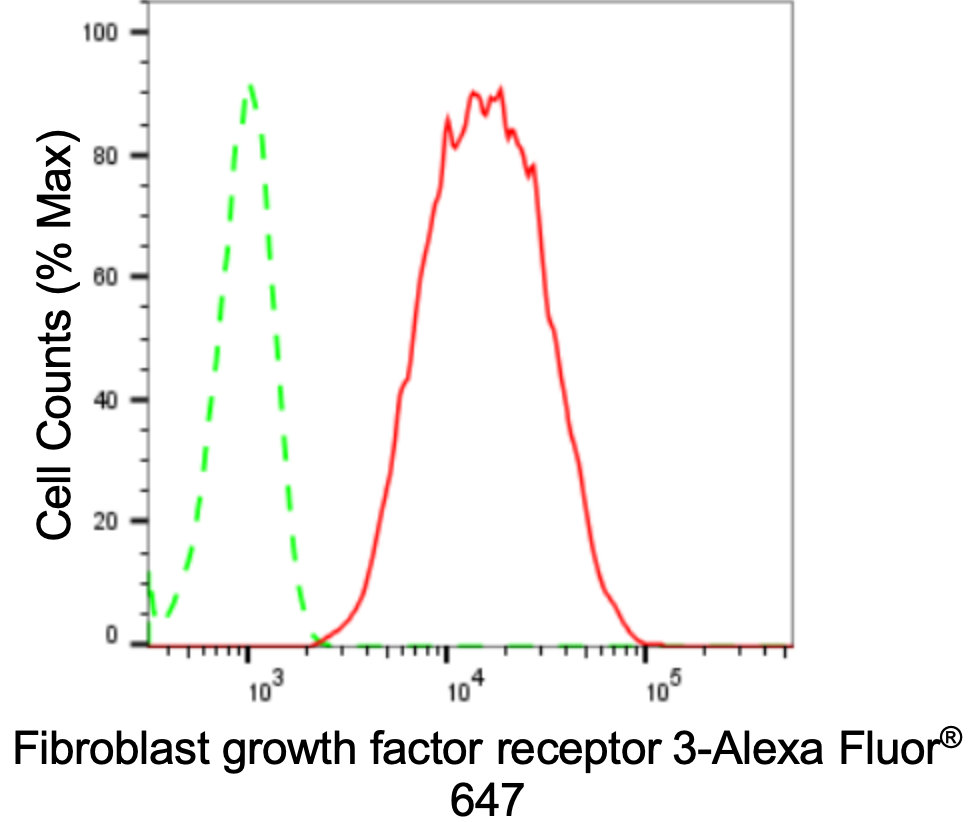 Flow cytometric analysis of Fibroblast growth factor receptor 3 expression in C2C12 cells using Fibroblast growth factor receptor 3 antibody. Green, isotype control; red, Fibroblast growth factor receptor 3.