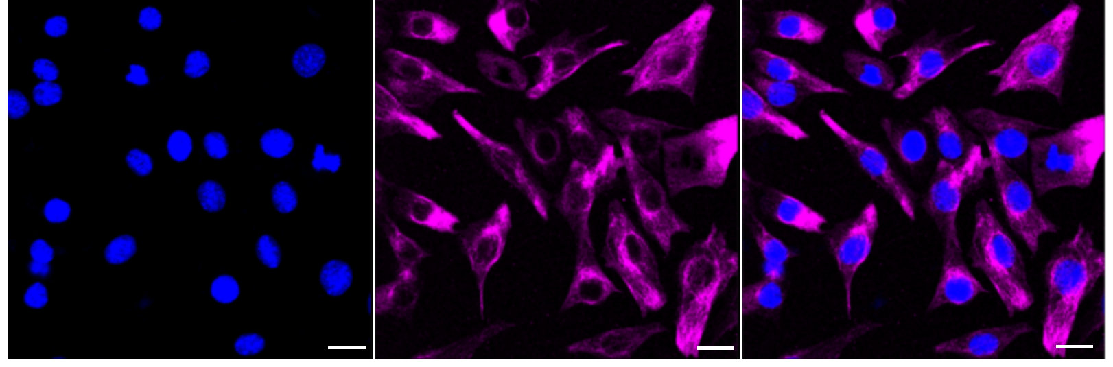 Immunocytochemical staining of C2C12 cells with Fibroblast growth factor receptor 3 antibody. Nuclei were stained blue with DAPI; Fibroblast growth factor receptor 3 was stained magenta with Alexa Fluor? 647. Images were taken using leica stellaris 5. Protein abundance based on laser intensity and smart gain: High. Scale bar: 20 μm.