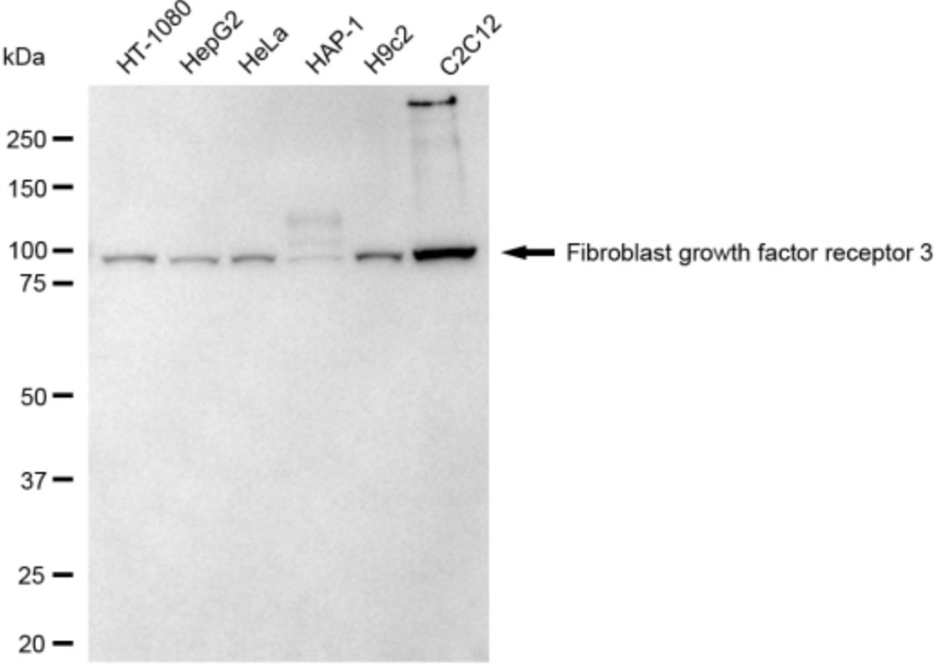 Western blotting analysis using Fibroblast growth factor receptor 3 antibody. Total cell lysates (30 μg) from various cell lines were loaded and separated by SDS-PAGE. The blot was incubated with Fibroblast growth factor receptor 3 antibody and HRP-conjugated goat anti-rabbit secondary antibody respectively.
