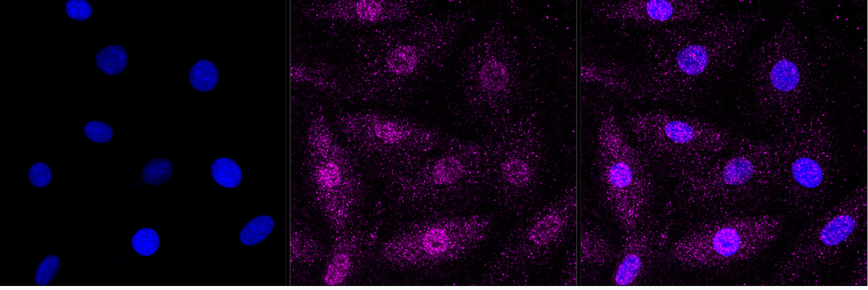 Immunocytochemical staining of H9C2 cells with FHL1 antibody. Nuclei were stained blue with DAPI; FHL1 was stained magenta with Alexa Fluor? 647. Images were taken using Leica stellaris 5. Protein abundance based on laser Intensity and smart gain:Medium. Scale bar, 20 μm.