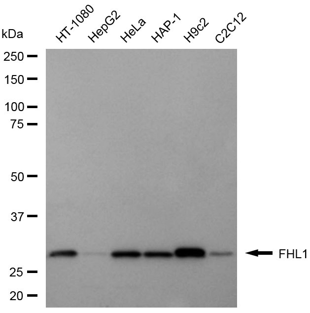 Western blotting analysis using FHL1 antibody. Total cell lysates (30 μg) from various cell lines were loaded and separated by SDS-PAGE. The blot was incubated with FHL1 antibody and HRP-conjugated goat anti-rabbit secondary antibody respectively.