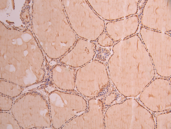 IHC image of CSB-RA121108A0HU diluted at 1:100 and staining in paraffin-embedded human thyroid tissue performed on a Leica BondTM system. After dewaxing and hydration, antigen retrieval was mediated by high pressure in a citrate buffer (pH 6.0). Section was blocked with 10% normal goat serum 30min at RT. Then primary antibody (1% BSA) was incubated at 4°C overnight. The primary is detected by a Goat anti-rabbit polymer IgG labeled by HRP and visualized using 0.05% DAB.
