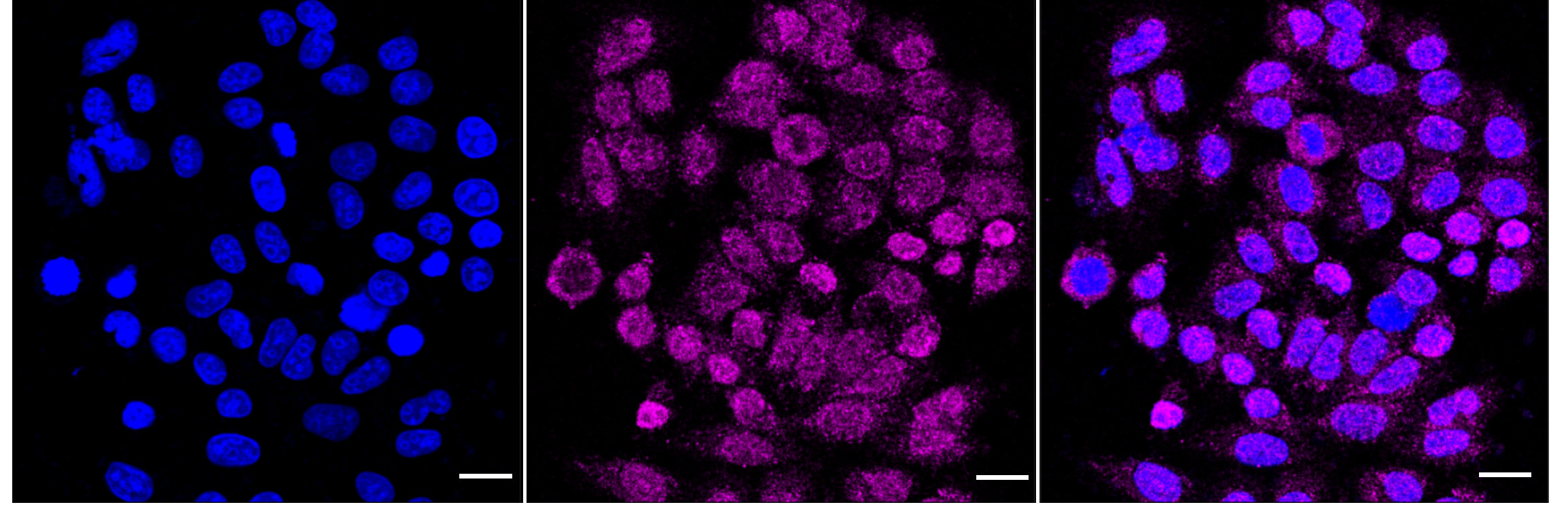 Immunocytochemical staining of HepG2 cells with flotillin 2 antibody. Nuclei were stained blue with DAPI; Flotillin 2 was stained magenta with Alexa Fluor? 647. Images were taken using Leica stellaris 5. Protein abundance based on laser Intensity and smart gain: Medium. Scale bar: 20 μm.
