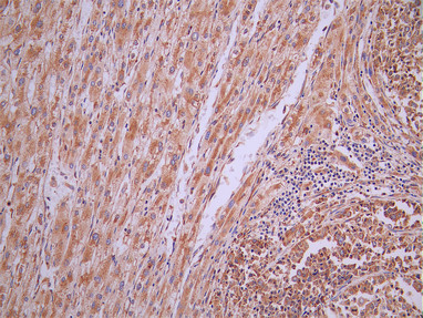 IHC image of CSB-RA970878A0HU diluted at 1:100 and staining in paraffin-embedded human liver cancer performed on a Leica BondTM system. After dewaxing and hydration, antigen retrieval was mediated by high pressure in a citrate buffer (pH 6.0). Section was blocked with 10% normal goat serum 30min at RT. Then primary antibody (1% BSA) was incubated at 4°C overnight. The primary is detected by a Goat anti-rabbit polymer IgG labeled by HRP and visualized using 0.05% DAB.