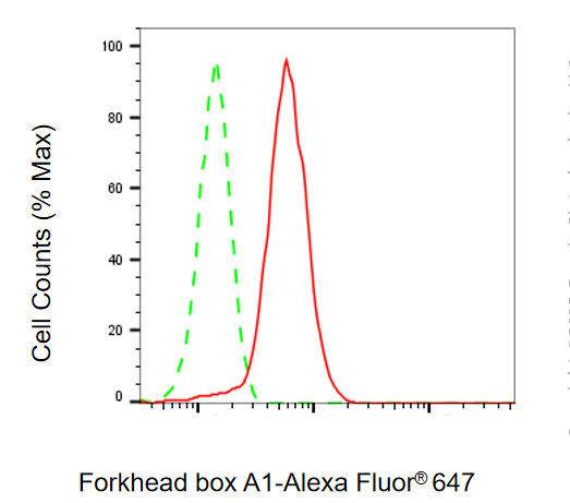 Flow cytometric analysis of Forkhead box A1 expression in HepG2 cells using Forkhead box A1 antibody. Green, isotype control; red, Forkhead box A1.