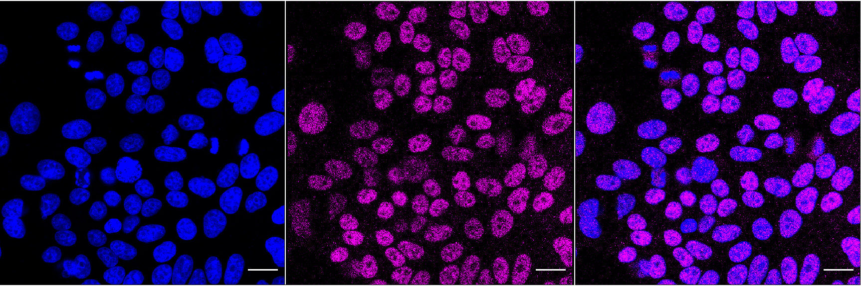 Immunocytochemical staining of HepG2 cells with Forkhead box A1 antibody. Nuclei were stained blue with DAPI; Forkhead box A1 was stained magenta with Alexa Fluor? 647. Images were taken using Leica stellaris 5. Protein abundance based on laser Intensity and smart gain: Medium. Scale bar, 20 μm.