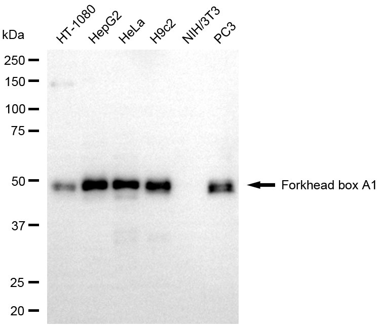 Western blotting analysis using forkhead box A1 antibody. Total cell lysates (30 μg) from various cell lines were loaded and separated by SDS-PAGE. The blot was incubated with forkhead box A1 antibody and HRP-conjugated goat anti-rabbit secondary antibody respectively.