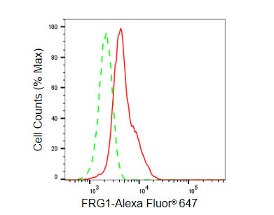 Flow cytometric analysis of FRG1 expression in HeLa cells using FRG1 antibody. Green, isotype control; red, FRG1.