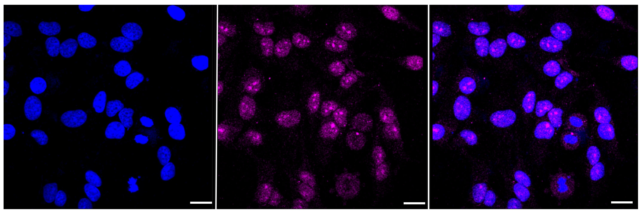 Immunocytochemical staining of Hela cells with FRG1 antibody. Nuclei were stained blue with DAPI; FRG1 was stained magenta with Alexa Fluor? 647. Images were taken using Leica stellaris 5. Protein abundance based on laser Intensity and smart gain: Medium. Scale bar: 20 μm.
