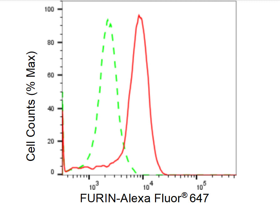 Flow cytometric analysis of FURIN expression in HeLa cells using FURIN antibody. Green, isotype control; red, FURIN.