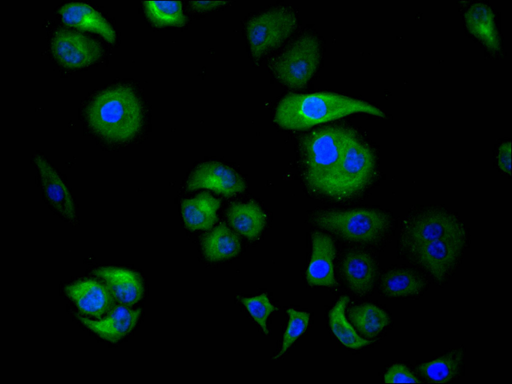 Immunofluorescence staining of Hela cell with CSB-RA162896A0HU at 1:50, counter-stained with DAPI. The cells were fixed in 4% formaldehyde, permeabilized using 0.2% Triton X-100 and blocked in 10% normal Goat Serum. The cells were then incubated with the antibody overnight at 4°C. The secondary antibody was Alexa Fluor 488-congugated AffiniPure Goat Anti-Rabbit IgG(H+L).