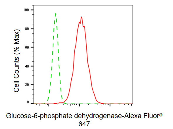 Flow cytometric analysis of glucose-6-phosphate dehydrogenase expression in HepG2 cells using glucose-6-phosphate dehydrogenase antibody. Green, isotype control; red, glucose-6-phosphate dehydrogenase.