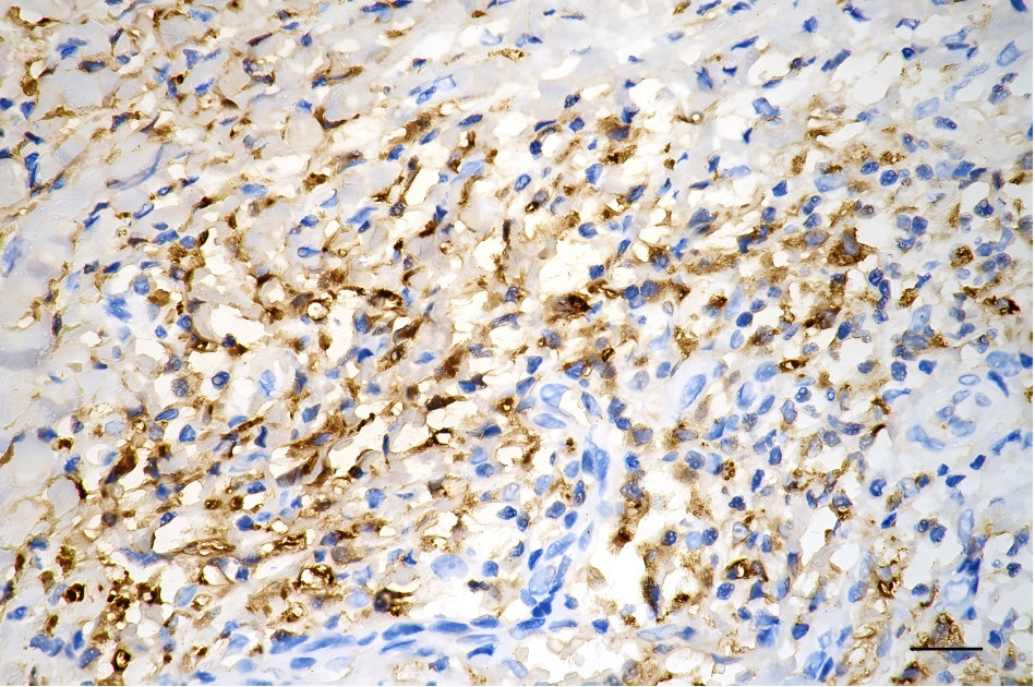 Immunohistochemistry was performed on paraffin-embedded human pancreatic adenocarcinoma using alpha glucosidase antibody. Antigen retrieval was done in sodium citrate buffer (pH 6.0). DAB was used for detection, with hematoxylin counterstaining. Images were acquired using a Nikon Ci-L Plus microscope (40× objective). Scale bar: 25 μm.