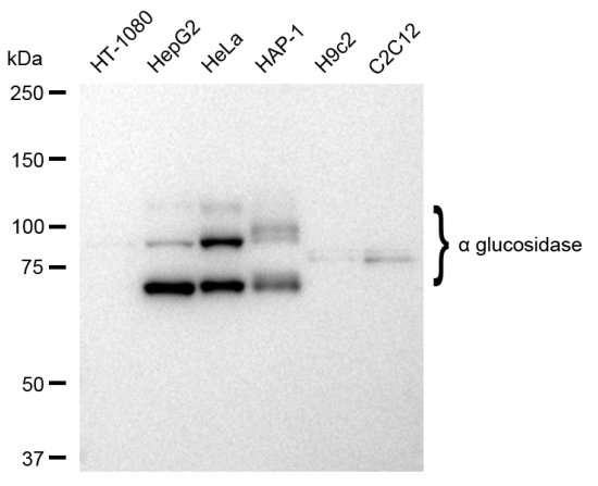 Western blotting analysis using alpha glucosidase antibody. Total cell lysates (30 μg) from various cell lines were loaded and separated by SDS-PAGE. The blot was incubated with alpha glucosidase antibody and HRP-conjugated goat anti-rabbit secondary antibody respectively.